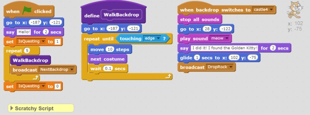 At this point we're pretty much done. If you have the "IsQuesting" variable on your stage, you can right click to remove it. We could also add some embellishments where when Scratchy walks past particular scenes there could be additional hazards.