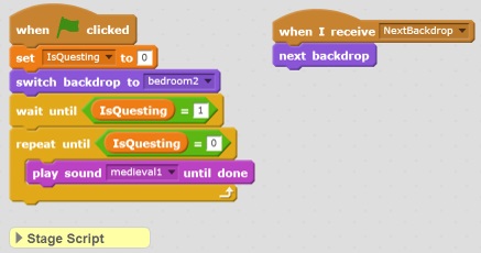 Sending the message is only half the work. Now we need to go to the stage and do something with that message. Add to the stage script a new WHEN I RECEIVE NEXTBACKDROP block followed by a NEXT BACKDROP block. Once that is complete we need to add 4 more backgrounds. Add the backdrops from the library: Brick Wall and Stairs, Castle 5, Water and Rocks, Grand Canyon, Castle 4. Remove any extra backdrops (including the white one we started with) if they are still there. We will also need a Switch Backdrop to Bedroom 2 block added so we start on the correct background when the skit is started. If we did everything right our Stage scripts should look like this: